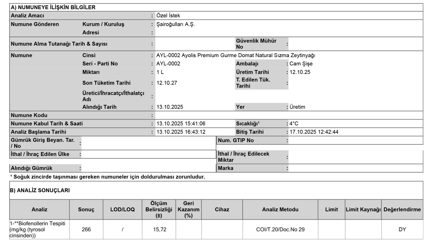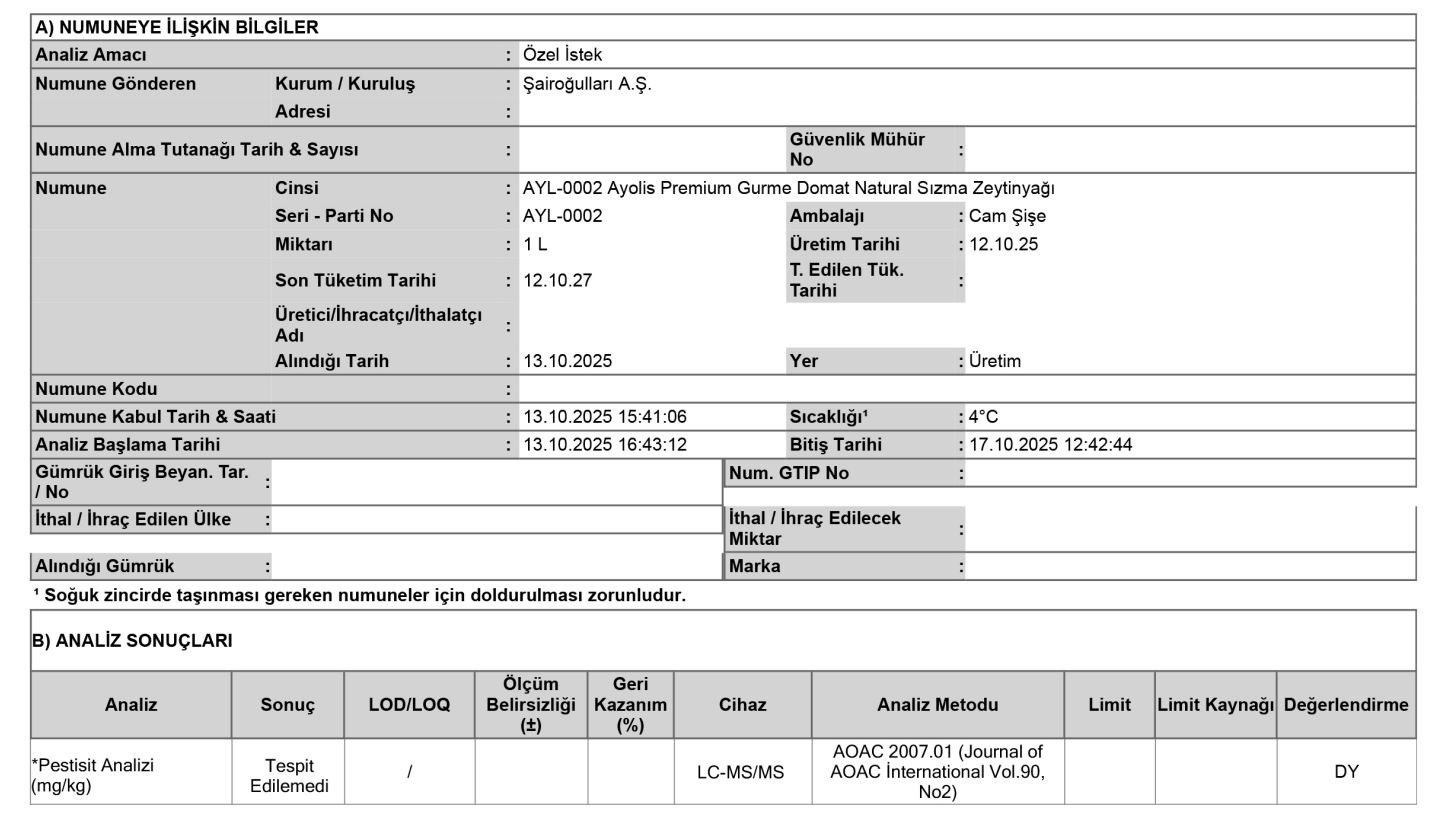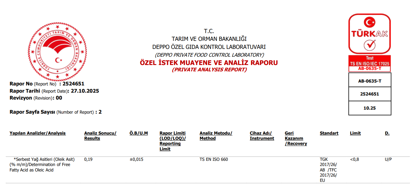 > Ürünlerimiz, kalite standartlarına uygun olarak düzenli analizlere tabi tutulur ve sağlık ile lezzet açısından en yüksek standartları karşılar.