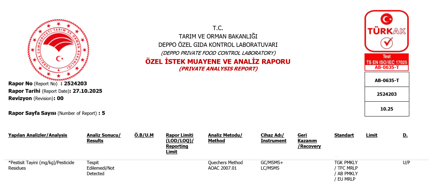 > Ürünlerimiz, kalite standartlarına uygun olarak düzenli analizlere tabi tutulur ve sağlık ile lezzet açısından en yüksek standartları karşılar.